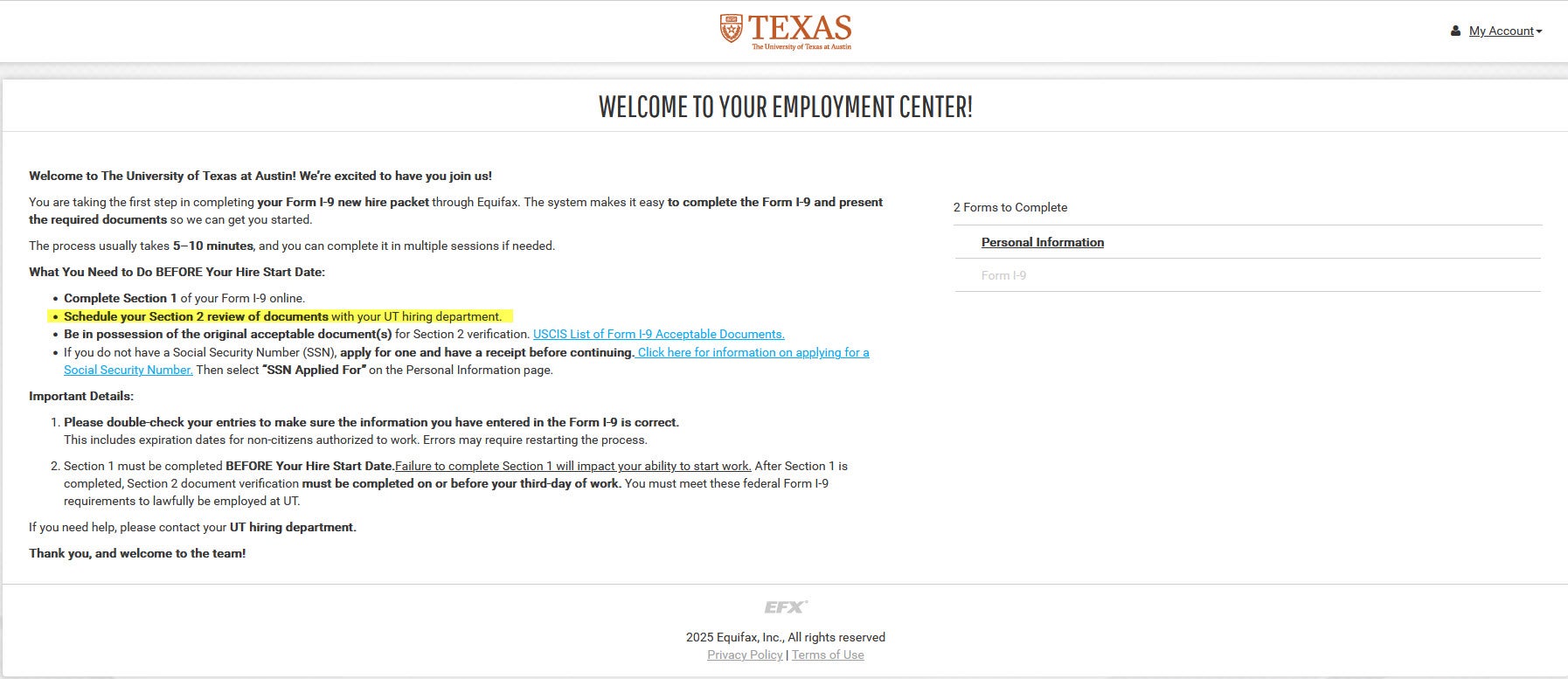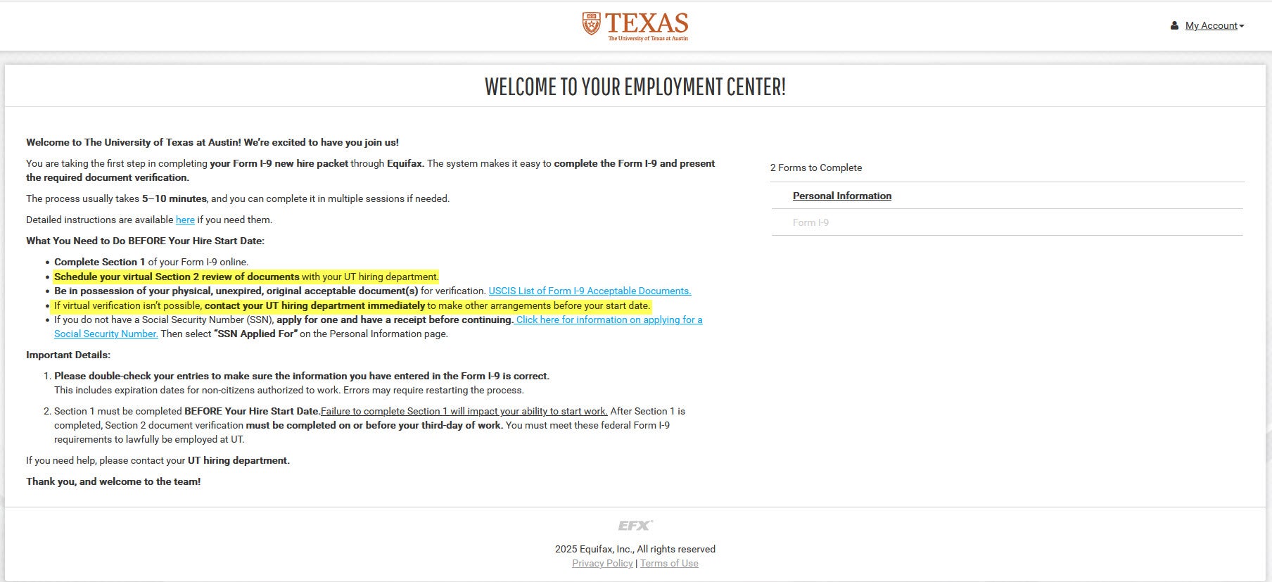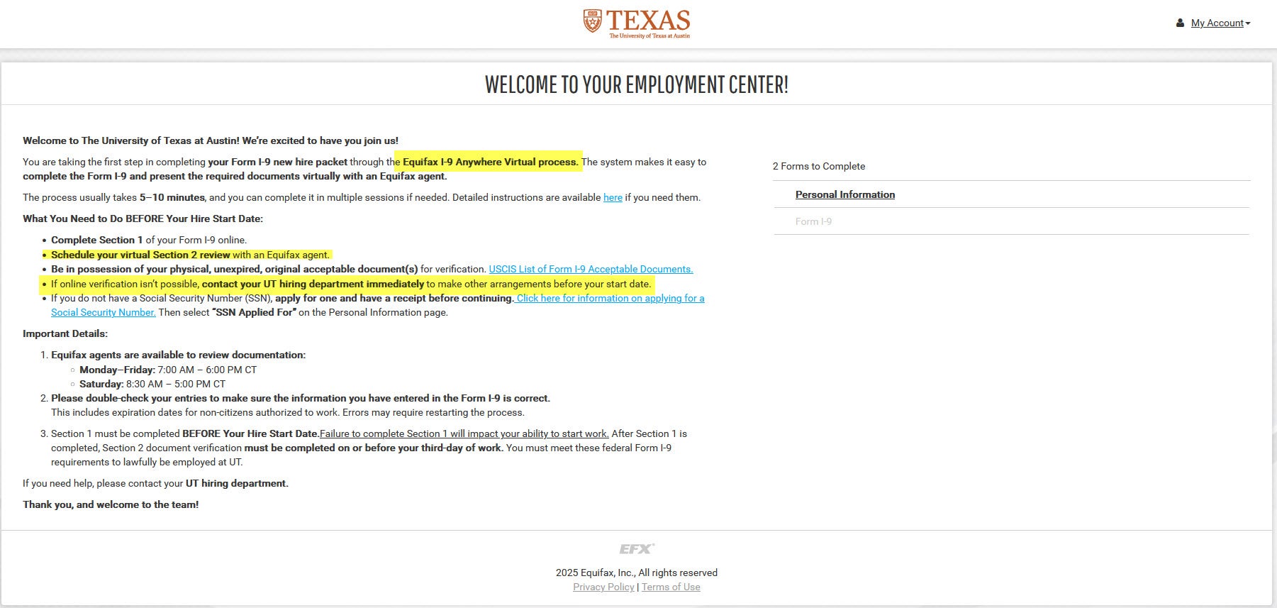The University of Texas at Austin utilizes Equifax, a secure, online tool to manage the I-9 process and comply with E-Verify requirements to verify an employee’s eligibility to work in the United States.